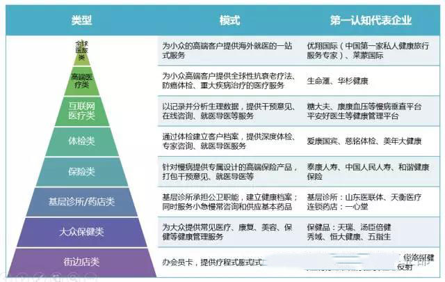健康管理的概念很大,細分領域眾多,且每個細分領域所需滿足的消費者的需求不同,企業所需的資源能力亦不相同?,F階段,市面上打著“健康管理”概念的企業,由低端到高端,由消費類到醫療類,大致可以分為8個大類(圖1):街邊店類、大眾保健類、基層診所/藥店類等等。每個類別都有一些代表性優秀企業,但更多的是在渾水摸魚,尤其是在街邊店類、大眾保健類等偏消費端領域。