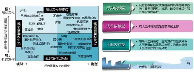各種慢性病之間存在根本差異,在建立有效商業模式之前,需先區分界定不同類別的慢性病。根據《創新者的處方》中分類,將慢性病通過兩個維度劃分為四類(慢性病矩陣):